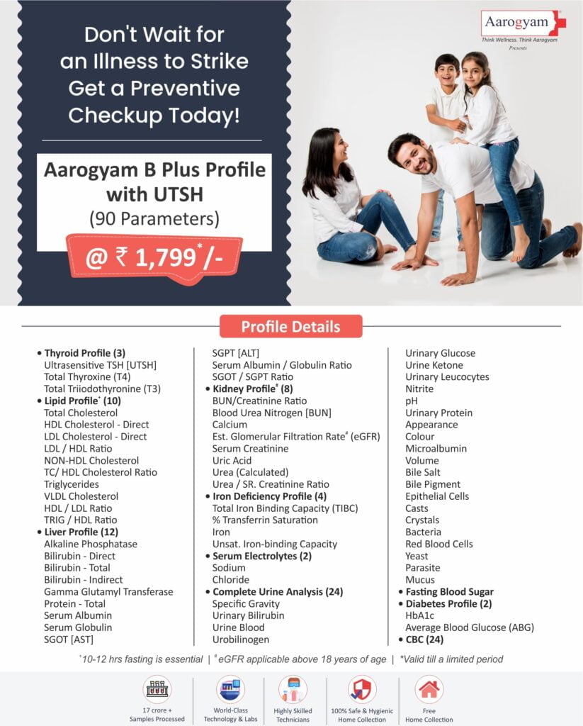 Aarogyam B Plus Profile with UTSH is a budget-friendly all-inclusive preventive package of 90 parameters recommended for people of all ages. The key feature of Aarogyam Plus series is the inclusion of Complete Urine Analysis + Fasting Blood Sugar analysis. It also provides a comprehensive picture of overall health status by determining thyroid, lipid, liver, and kidney health. CBC, diabetes, and urine analysis gives an accurate diagnosis and complete healthcare. Detect health issues early and get treated timely.