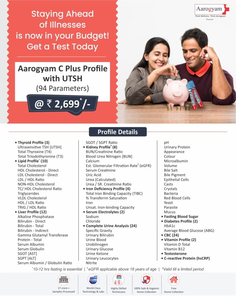 Aarogyam C Plus Profile (most popular in the Aarogyam Plus series) with UTSH is a complete health checkup package of 94 parameters. The key feature of Aarogyam Plus series is the inclusion of Complete Urine Analysis + Fasting Blood Sugar analysis. Along with Thyroid, Lipid, Liver and Kidney health, this package also includes vitamins, testosterone, and C Reactive Protein (hsCRP). CRP is the most critical indicator of coronary artery disease. This package ensures that you stay ahead of health problems, especially heart issues.