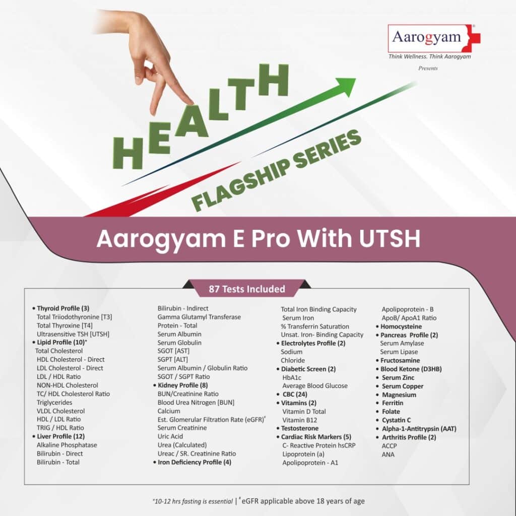 Aarogyam E Pro with UTSH is a complete package of 87 parameters. Its unique feature is that it covers cystatin C for kidney health and antitrypsin for lung health with accurate diagnosis. It also helps understand if a patient is suffering from arthritis. It’s other parameters, such as CBC, diabetes, vitamins, etc., make it an ideal profile for full-body health checkup. It is highly recommended to all age groups for preventive care at affordable rates.